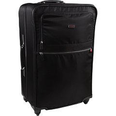 This larger, lightweight packing case offers a 4-wheel system that provides easily maneuverability in every direction, the interior is divided into two sections for easy packing and features several smaller pockets for accessories, the exterior has front and back zip pockets for easy-access items, made from lightweight nylon with leather trim